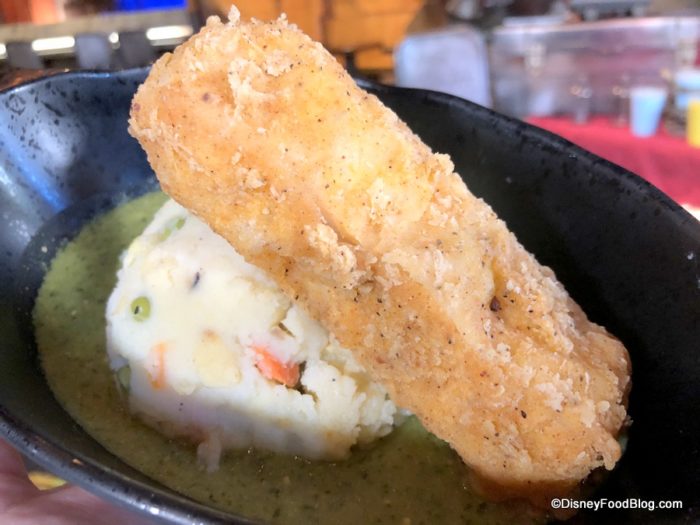 Fried Endorian Tip-Yip is a dish that will be familiar in some ways — because it’s fried chicken! But of course, it’s had an other-worldly twist in that it’s a block. Seriously: it’s cut into a rectangular cube with straight edges and no sense of what that meat should look like organically. Rather than the typical Disney Parks chicken nugget breading, the Tip-Yip has a panko-style breading, giving it a different texture than you might expect from a chicken tender, essentially, in the Parks. And unfortunately, aside from the breading, the chicken didn’t have much flavor. Even more unfortunately: it was dry. Way overcooked. Maybe it’s the Tip-Yip way, but meh.