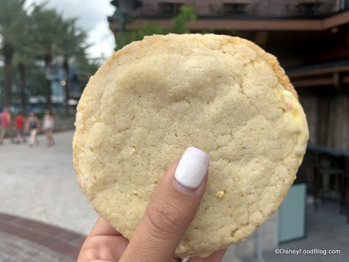 The Frozcato Sugar Cookie Sandwich has arrived in celebration of summer and will be available through the season for $8.00. However, one other thing has arrived with the summer… and that’s the famous Florida heat. So the one unfortunate thing here (as with many frozen treats enjoyed in Disney World) is that it melts quickly, so you’ll likely need to eat quickly as well.