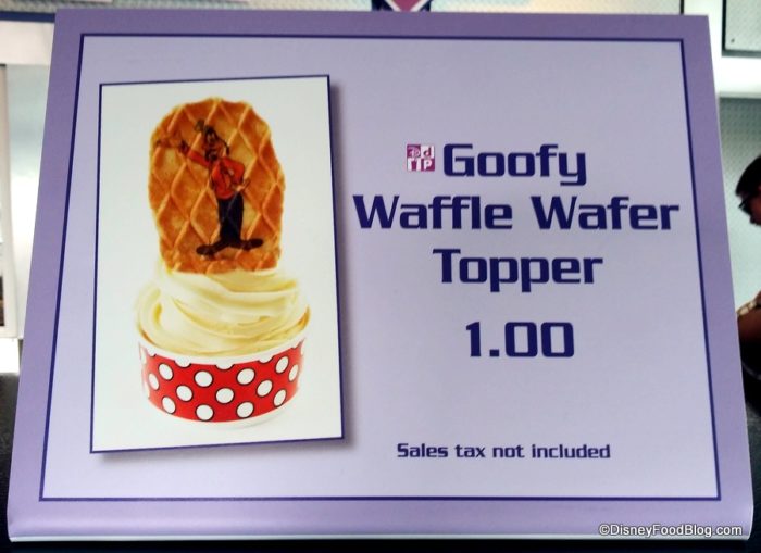 However, you’ll find the Waffle Wafer Toppers reflected on the menu a little differently depending on where you go. For instance, in Fantasyland’s Storybook Treats, the Minnie Waffle Wafer Topper is listed on the menu as being $1.00 priced on its own, to add to any treat of your choice.
