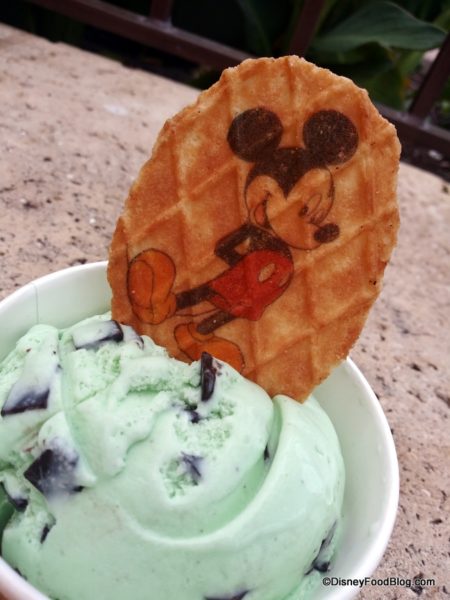 The Mickey Waffle Wafer Topped Scoop is $5.99 (or a Disney Dining Plan snack credit) at the Parlor.