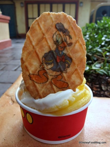 Two options are available in Adventureland thanks to the land’s two classic soft-serve signatures. At Sunshine Tree Terrace, home of the Citrus Swirl, you can get a Donald Waffle Wafer Topper on your choice of soft serve in a cup.