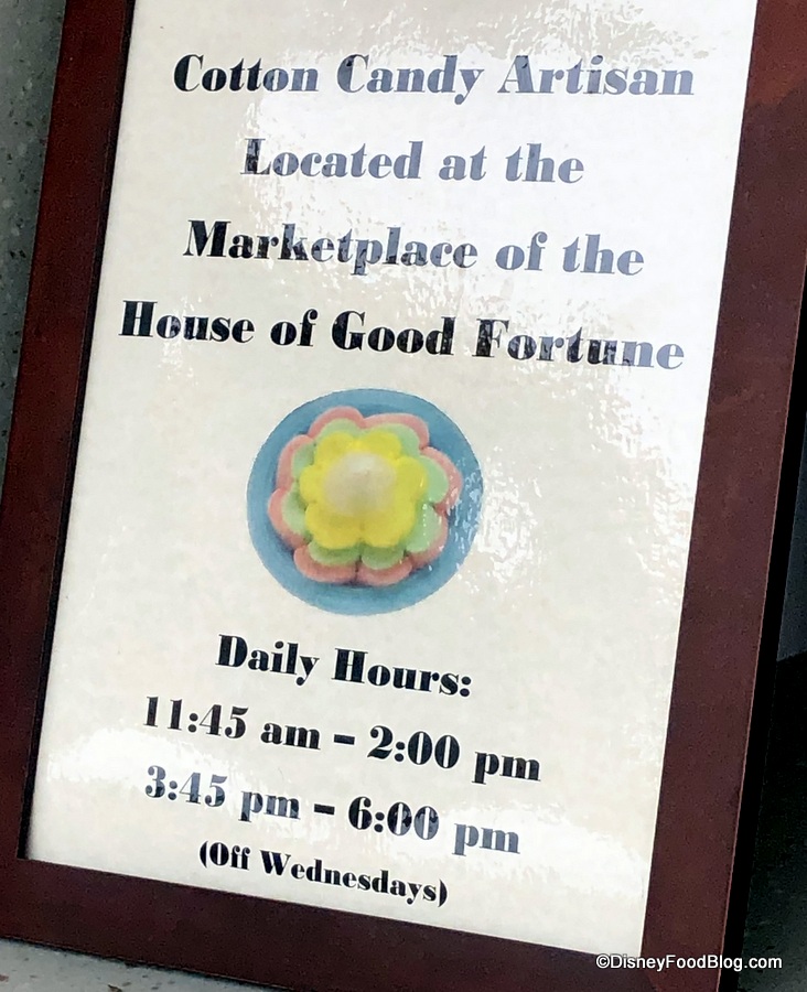 I say “may” depending on what time of day you visit, as specific hours are posted for the Cotton Candy Artisan. And there’s a note stating “Off Wednesdays” on the sign.