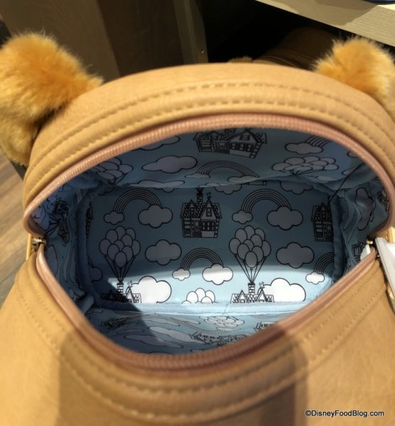 The bag is complete with Dug’s charming characteristics, including his excited eyes, heartwarming smile, and big brown nose. As an added bonus, the inside of the Loungefly is covered with line drawings from the Pixar film Up.