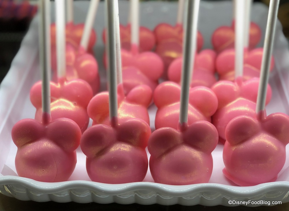 Each Minnie-inspired cake pop consists of vanilla cake dipped in an Imagination Pink-colored white chocolate coating. The pops are sprayed with gold shimmer for a subtle sheen!
