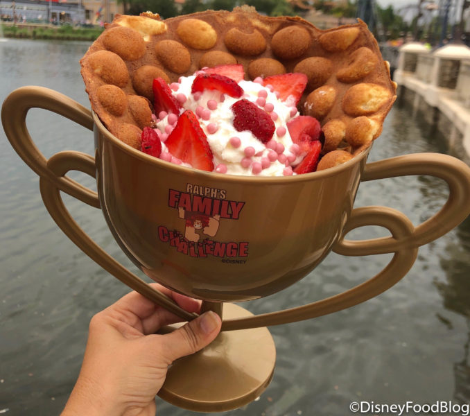 The Wreck-It Ralph Sundae has made a big smash before on our blog. The Family Challenge Trophy is a HUGE reminder of the accomplishment your family or you (we could have one entirely to ourselves) made by finishing those last few bites of the sundae. And, we’ve also seen the Salted Caramel and Strawberry Bubble Waffles pop up with their sweet and crunchy goodness. But, we’ve never seen them combined TOGETHER like this before!!