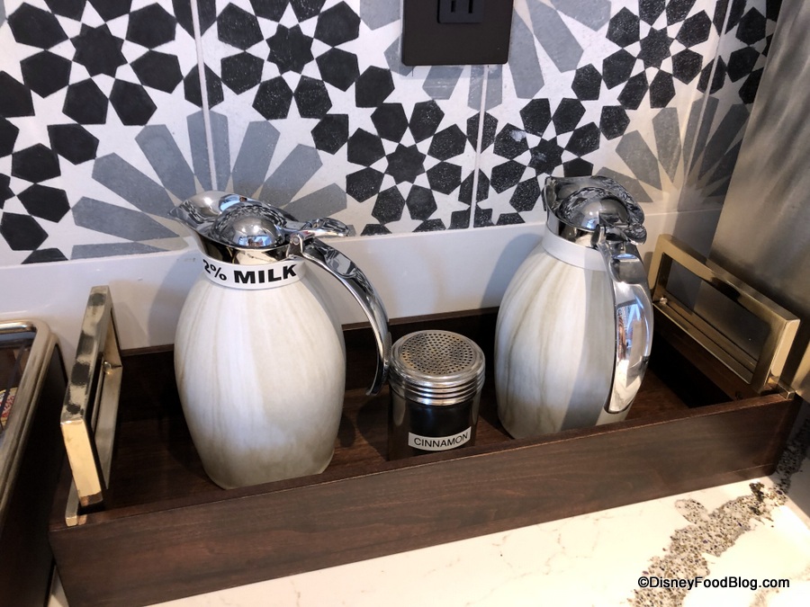 To the left of the bar, tucked under the Lounge’s grand staircase, is an area with coffee additions like milk, cinnamon, and sugar.