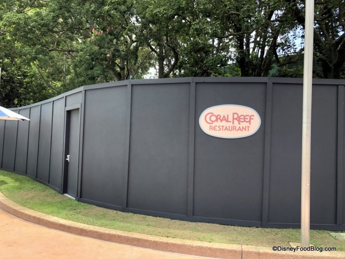 When we were in Epcot, we noticed a construction wall outside Coral Reef. The restaurant’s main sign is covered, but the dining location is still open. We’ll let you know if we learn more about the construction!