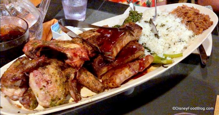 The Main Course is a platter that consists of a bed of Coconut-Jasmine Rice, Roasted Broccolini with Basil-Olive Oil, Aloha Pulled Pork. Polynesian Barbecued Ribs, and Roasted Chicken.