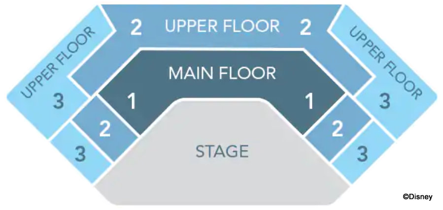 Spirit of Aloha has three categories of seating arrayed in front of the stage on two levels. Category 1 seating is front and center, close to the action on stage. Category 2 is in the center of the second level of seating and on the right and left flanks of the lower level Category 1 seating. Category three seating is furthest to the right and left of the seating area on both the lower and upper levels.
