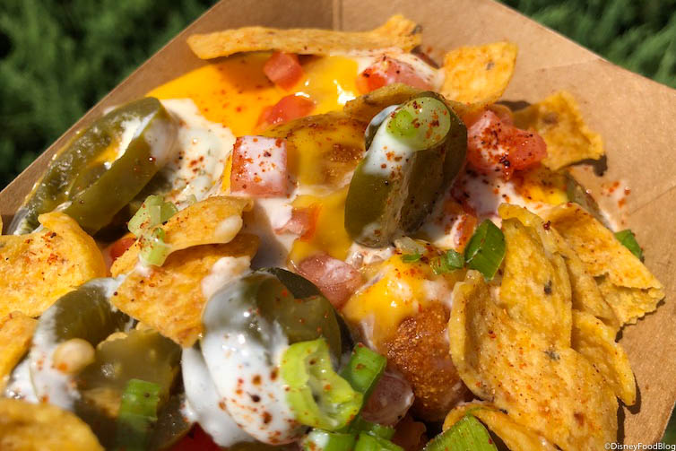 These are topped with cheese sauce, chili-lime seasoning, jalapeños, tomatoes, garlic ranch, corn chips, and green onions!