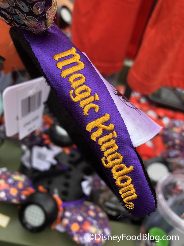 They have a colorful print covered in all three sisters and a few other spooky-fun items. And the side of them reads Magic Kingdom.