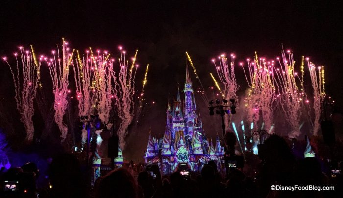 An array of projections transform Cinderella Castle throughout the show with bursts of orange, red, yellow, and pink fireworks in the sky.