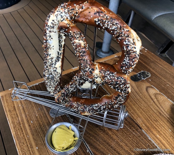 This seriously jumbo pretzel is topped with various seeds and served with spicy German mustard and beer-cheese fondue at Jock Lindsay’s Hangar Bar in Disney Springs for $8.