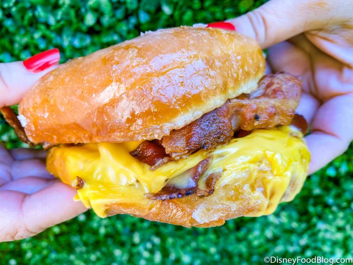 Over at Everglazed Donuts & Cold Brew in Disney Springs, there’s a treat that cheese lovers HAVE to try, simply for the novelty of it. On the sandwich menu, you’ll find what is called The Grilled Cheeeeeese (yes, it actually DOES have that many e’s), but instead of getting the sandwich made on a sweet bun, we encourage you to have it grilled on a donut!