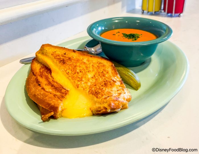 This one is served with tomato-basil soup dipper, potato barrels, or vegetable macaroni salad at Woody’s Lunch Box in Hollywood Studios for $9.99.