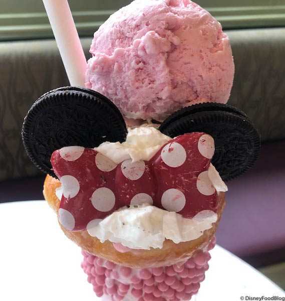 This is a strawberry milkshake topped with a strawberry glazed donut, chocolate cookies, a chocolate Minnie bow, a strawberry ice cream cone, and whipped cream. There’s a LOT going on with this shake but in the best way.