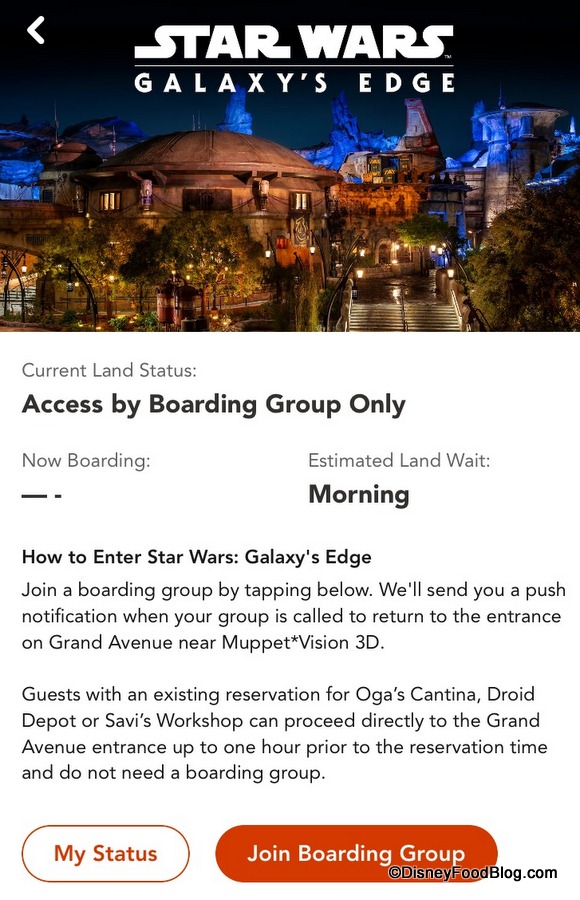 “Open,” however, means that Boarding Groups are not in use at the time and that anybody is welcome to enter Galaxy’s Edge!