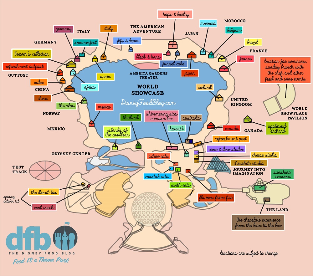 Maps are always available at Epcot to pick up at the park’s entrance as needed. But if you’d prefer to strategize your Food Booth visits in advance, check out our DFB 2019 Epcot Food and Wine Festival Map! (Click the image to enlarge for easier reading.)