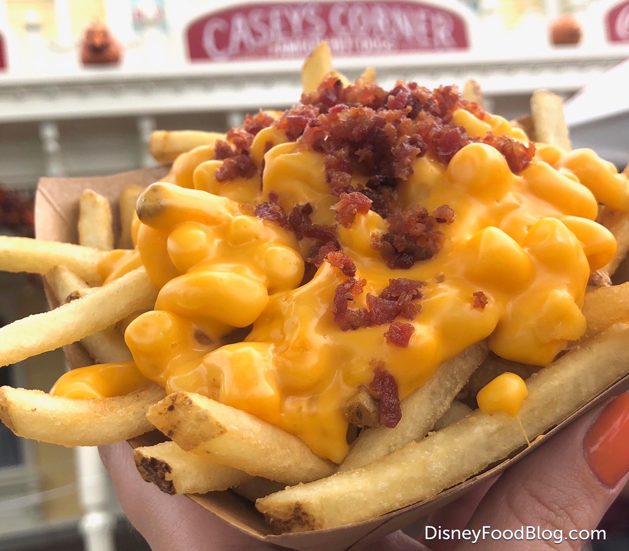 We love bacon here at DFB, which is why we love the fact that there are several bacon treats and eats in Disney World! When we’re in the mood for lots of carbs and a light sprinkling of bacon, we like to grab the Bacon Mac & Cheese Fries from Casey’s Corner.