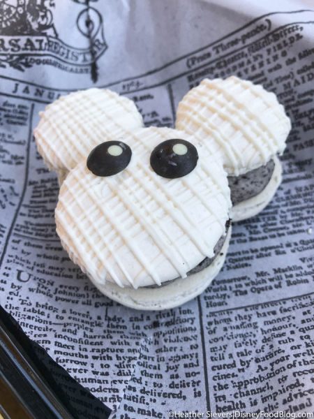 Jolly Holiday Bakery Cafe is always a great spot to grab specialty treats in the park. We were happy to see they still have some of their Main Street Electrical Parade treats on the menu and now today all of their Halloween offerings have materialized! First up, our favorite spooky Mummy Macaron is back on the scene!