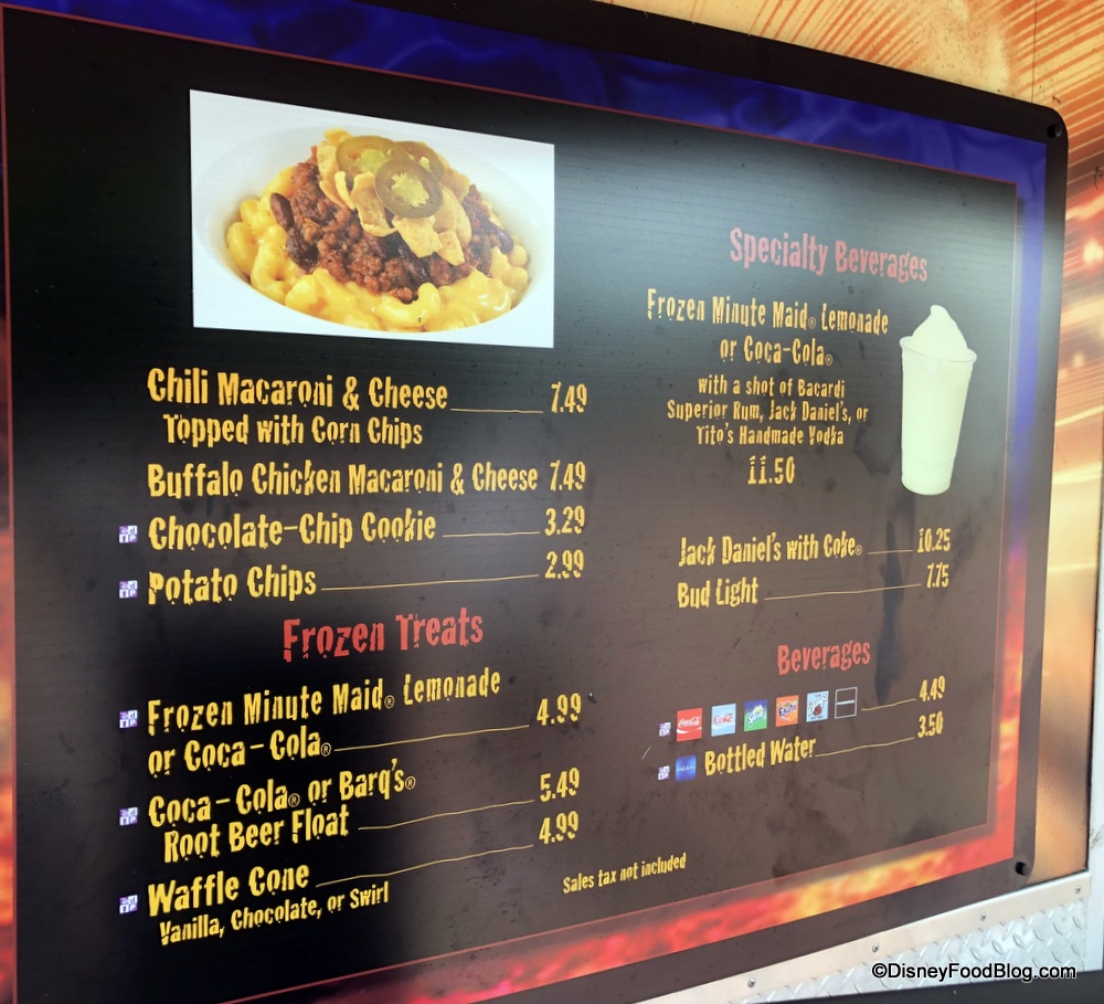 Remember when we told you that the KRNR The Rock Station cart near Rock ‘n’ Roller Coaster was going to remove hotdogs from the menu and instead feature macaroni and cheese? That change has now taken place, as you can see on the menu below. We actually tried the Buffalo Chicken Macaroni and Cheese when it was first introduced, and we really enjoyed it!
