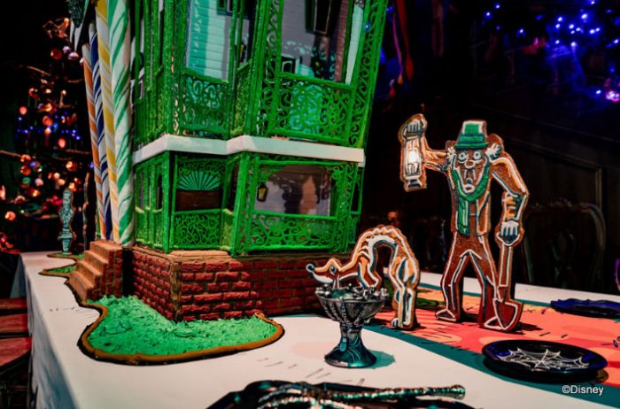 Ornate green sugar work surrounds the Mansion, and “15 spirited Haunted Mansion residents” (also made of gingerbread, of course!) play their parts in recreating the iconic ride.