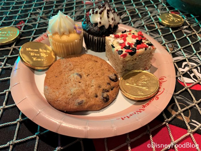 Lastly, the bite-sized Rice Krispie Treats! They are standard (read: delicious) Disney Rice Krispie Treats, pre-cut into bite-sized squares and topped with a thin layer of vanilla frosting and pirate-colored sprinkles.