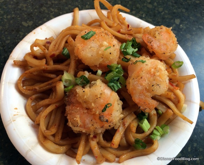 Feast your eyes on this embarrassment of riches! The spicy Black Pepper Shrimp has a light panko coating and is served up hot and fresh on a bed of perfectly cooked garlicky noodles!