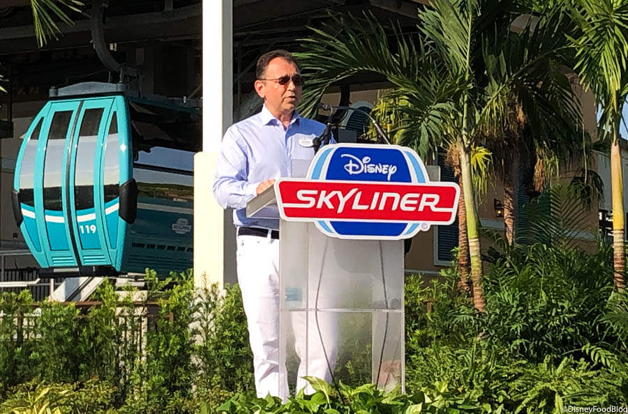 The ceremony kicked off at Caribbean Beach Resort with Stephen, the Walt Disney World Ambassador. He spoke about the Skyliner and introduced Thomas, the senior VP of Walt Disney World Resorts.