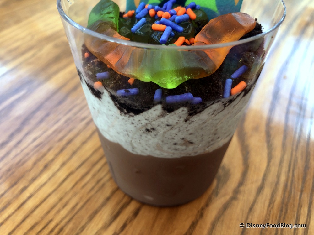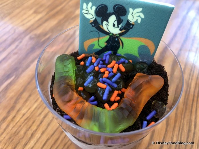 The Graveyard Worms ‘n’ Dirt was everything we know and love about this traditional dessert — minus one thing we’ll get to in a sec. This dessert consists of crumbles of chocolate cookies with layers of chocolate pudding and whipped cream…