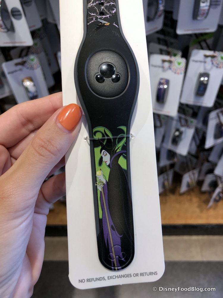 The new MagicBand has the updated packaging that Disney’s been releasing their newer MagicBands with. One side of the band features a very pensive Maleficent while the other has her raven sidekick and lots of spikey thorns!