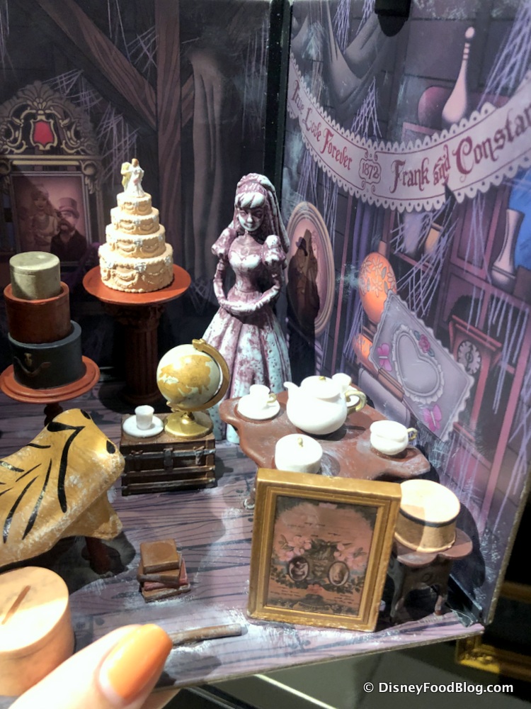 From its miniature chaise lounge to its empty birdcage, globe, trunk, pedestal and wedding cake, we feel like we’re on a teeny-tiny Haunted Mansion! And there’s so many hats and hatboxes, but sadly no Hatbox Ghost in sight! (But if you’re looking for him, check out the Hatbox Ghost Tiki Mug for sale at Disney’s Polynesian Village Resort here!)