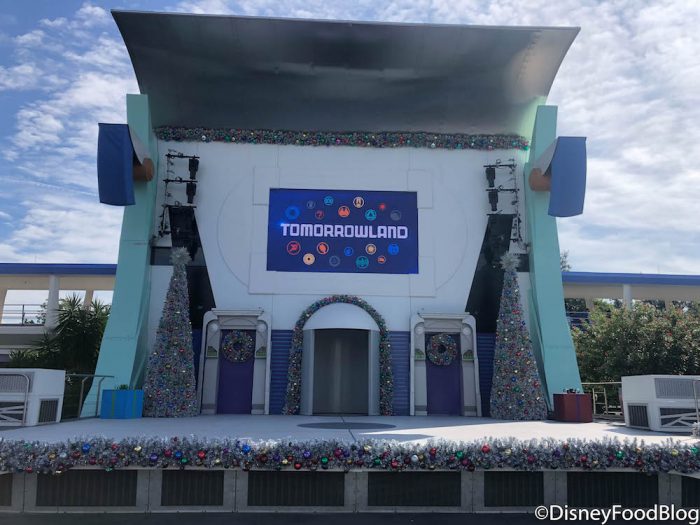 The Tomorrowland Stage has decked its halls in silver! Christmas trees, wreaths, and garlands transform the stage with colorful ornaments to make everything bright and cheery.