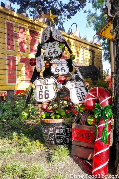 Cars Land has always been SO impressive with theming, so we’re not surprised at all that Radiator Springs is EXTRA festive! Flo’s V8 Cafe has strung up some “homemade” garland, which looks to be made with — what else — car parts!