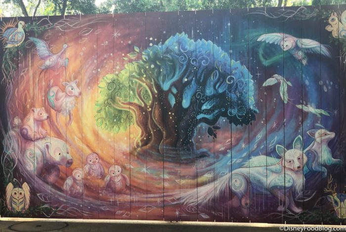 The handpainted mural features the Tree of Life at its center, rendered in a diffused palette of blues, greens, reds, browns, and golds. Arctic critters much like the ones being featured as puppets at Animal Kingdom this Christmas season encircle the tree in grand, flowing brushstrokes, almost like the circle of life itself!
