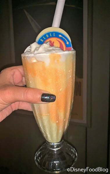 The Resistance Shake is Pineapple Dole Whip and Orange Dole Whip swirl with a sugar rim and topped with a Rebel Alliance chocolate piece. We have to say the Orange Dole Whip stole the show, and it mostly tasted like a creamsicle. Our shake was notably missing the sugar rim that we saw in the official Disney promo pics, 🙁 but we did get the yummy and adorable Rebel white chocolate piece!