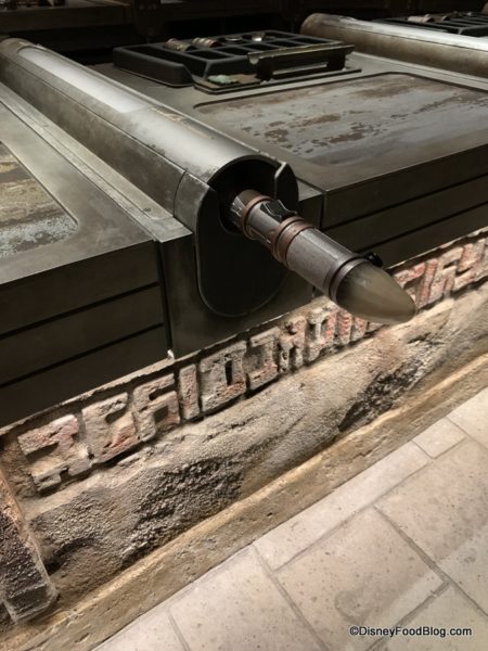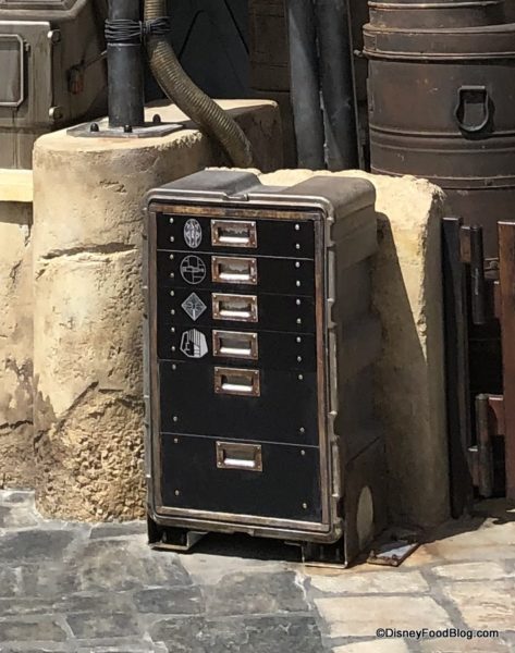 The same tell-tale blue banner graces the front of the building. (Remember — there are no real “signs” in Galaxy’s Edge, so keep your eyes peeled!)