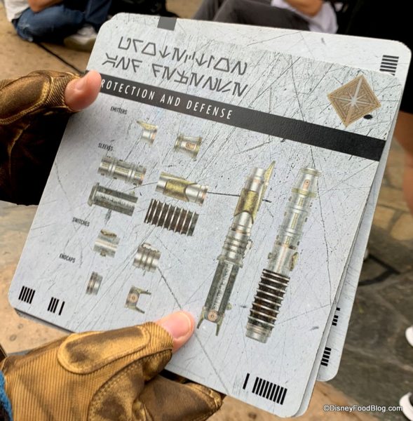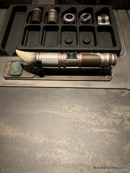 When your group is called into Savi’s Workshop, you’ll be shown to a station. Theatrical lighting and dramatic Cast Member performances create a ceremony in which the power of the lightsaber is described and the Kyber Crystals (that’s what powers lightsabers, dontcha know!) are discussed and displayed.