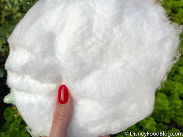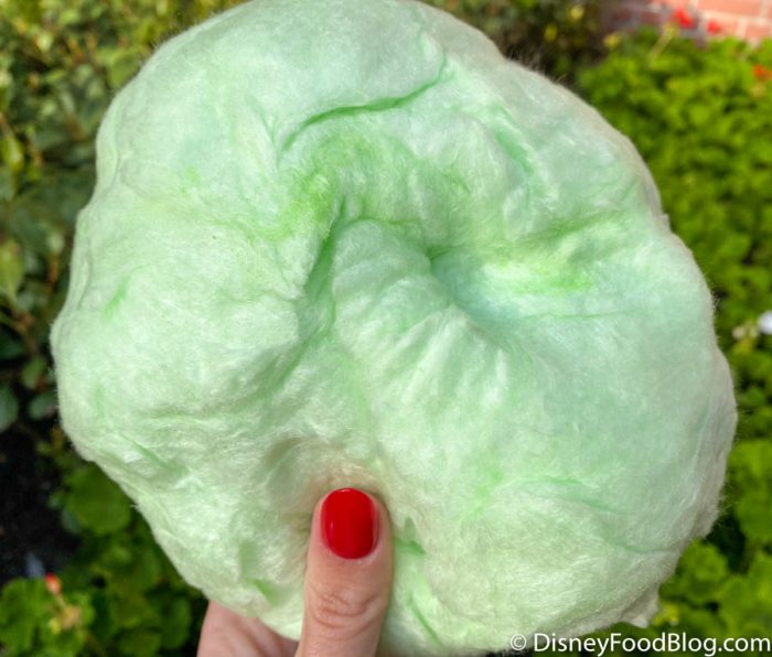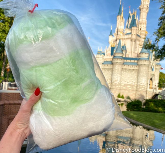 You can pick up the Citrus Apple Cotton Candy for $5 (or a snack credit if you’re on the Disney Dining Plan)over at the Popcorn Cart in the Hub Near Cinderella Castle in Magic Kingdom.