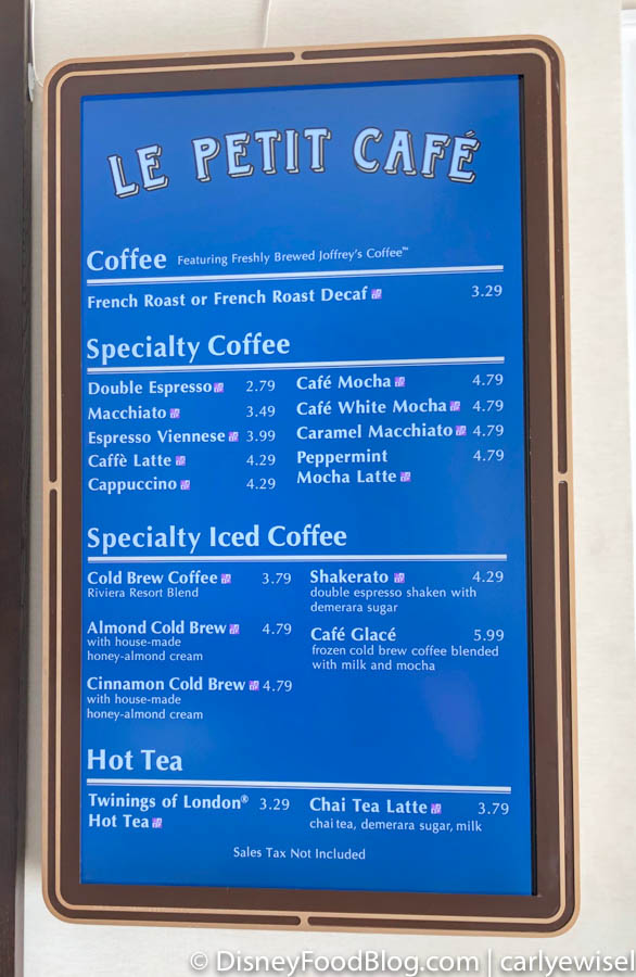 Le Petit Cafe serves fresh coffee and pastries in the morning and get this…it turns into a WINE BAR in the evening that serves drinks and desserts. Here was their morning coffee and tea menu: