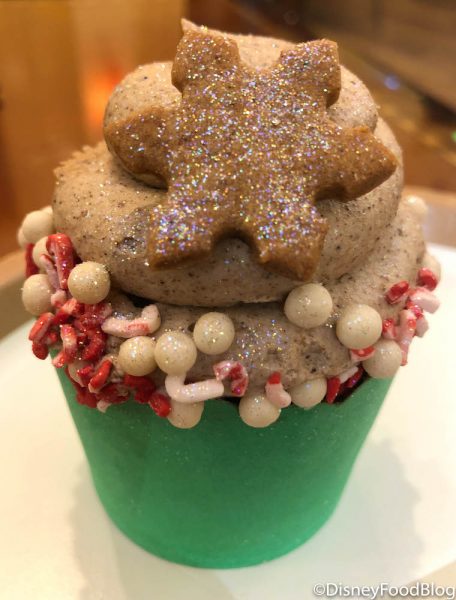 The spiced vanilla cupcake is filled with gingerbread spiced buttercream and topped with even MORE buttercream, white chocolate crispies, peppermint sprinkles, a gingerbread snowflake, and lots of edible glitter (!!!).
