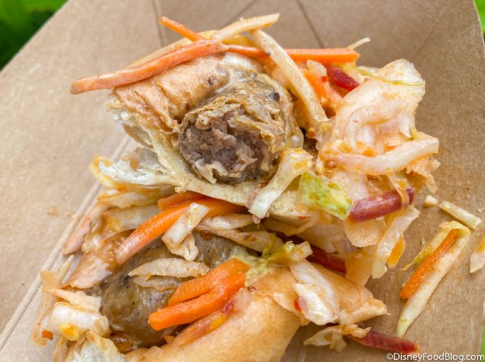 A mini-sausage is topped with Pickled Ginger Slaw and tucked inside of a pillowy soft roll.