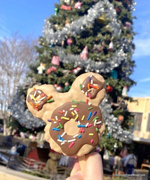 We think its design closely resembles the chocolate glazed Celebration Mickey Donuts you can get at Disney World’s Main Street Bakery at the Magic Kingdom!