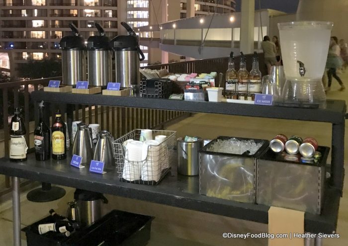Beverages here include hot tea and coffee, ice water, canned soda, and some additions like Kahlua, Frangelico, and Bailey’s for the grown-ups.
