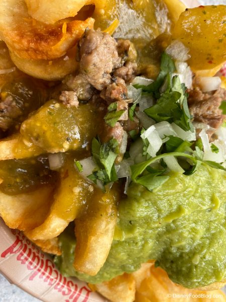 Disney California Adventure is turning up the heat at Award Wieners with their Carne Asada Fries that we shared with you a few days ago. The filmstrip fries are topped with marinated carne asada, cheddar cheese, cilantro and onion, with Salsa de Arbol, and guacamole. Um, YUM!