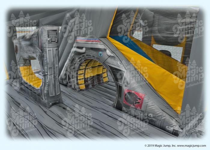 To add a li’l extra thrill to your trip through hyperspace, you can tackle inflatable pop-up obstacles like a bunk, holo-map (featuring a holographic image of the Death Star), and a storage container in the main cabin. And, you can defend yourself against the Empire or the First Order by manning the laser cannon turret or stepping to the climber/slide in the middle of the ship. Make sure to look up, Rebels, ’cause the ceiling hatch also has graphic of an epic battle between TIE fighters and a Star Destroyer!