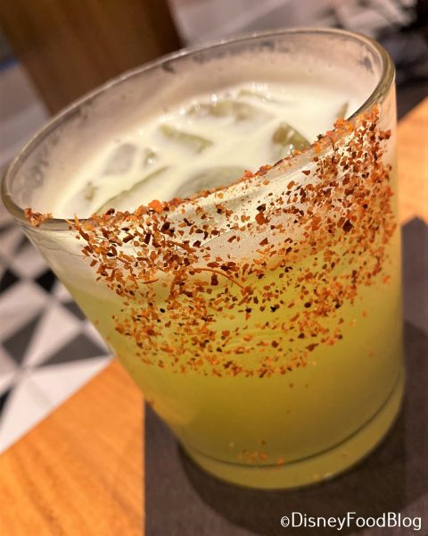 The Apple Temptation is made with mezcal and fresh-pressed green apple juice, and finished with a tajin chile-lime rim. And when they say freshly-pressed apple juice, they mean it — the juice is literally squeezed with each drink order.