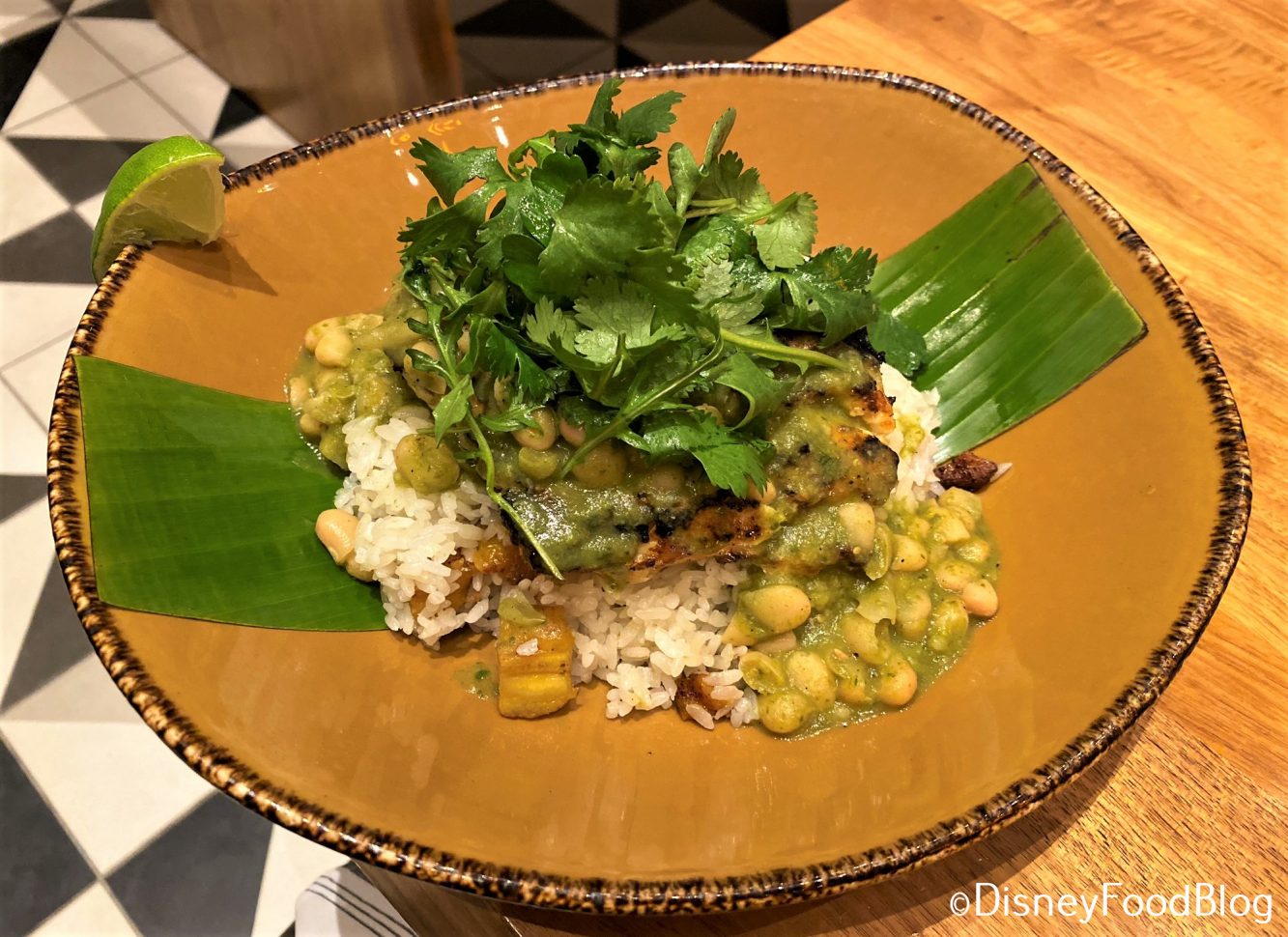 This herb-filled dish is grilled grouper, made with cilantro, epazote, and parsley. It’s served on a bed of white beans and plantain rice, with spicy salad greens, and features a green mole sauce.