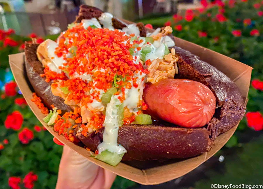 This thing comes LOADED with toppings and tbh, it’s awesome! Maybe the black bun makes this Villains After Hours treat look a little gloomy, but it certainly has a nice kick to it!