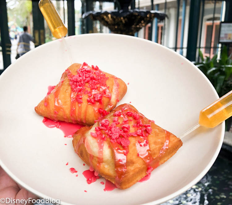 If you’re looking to really SPICE up your holiday, this next dessert was a favorite of ours when we first reported on it – the Cinna-Hot Beignets at Scat Cat’s Club at Port Orleans French Quarter! Imagine perfectly puffed Mickey-shaped donuts drizzled with sweet cinnamon sauce and crushed Hot Tamale candies!